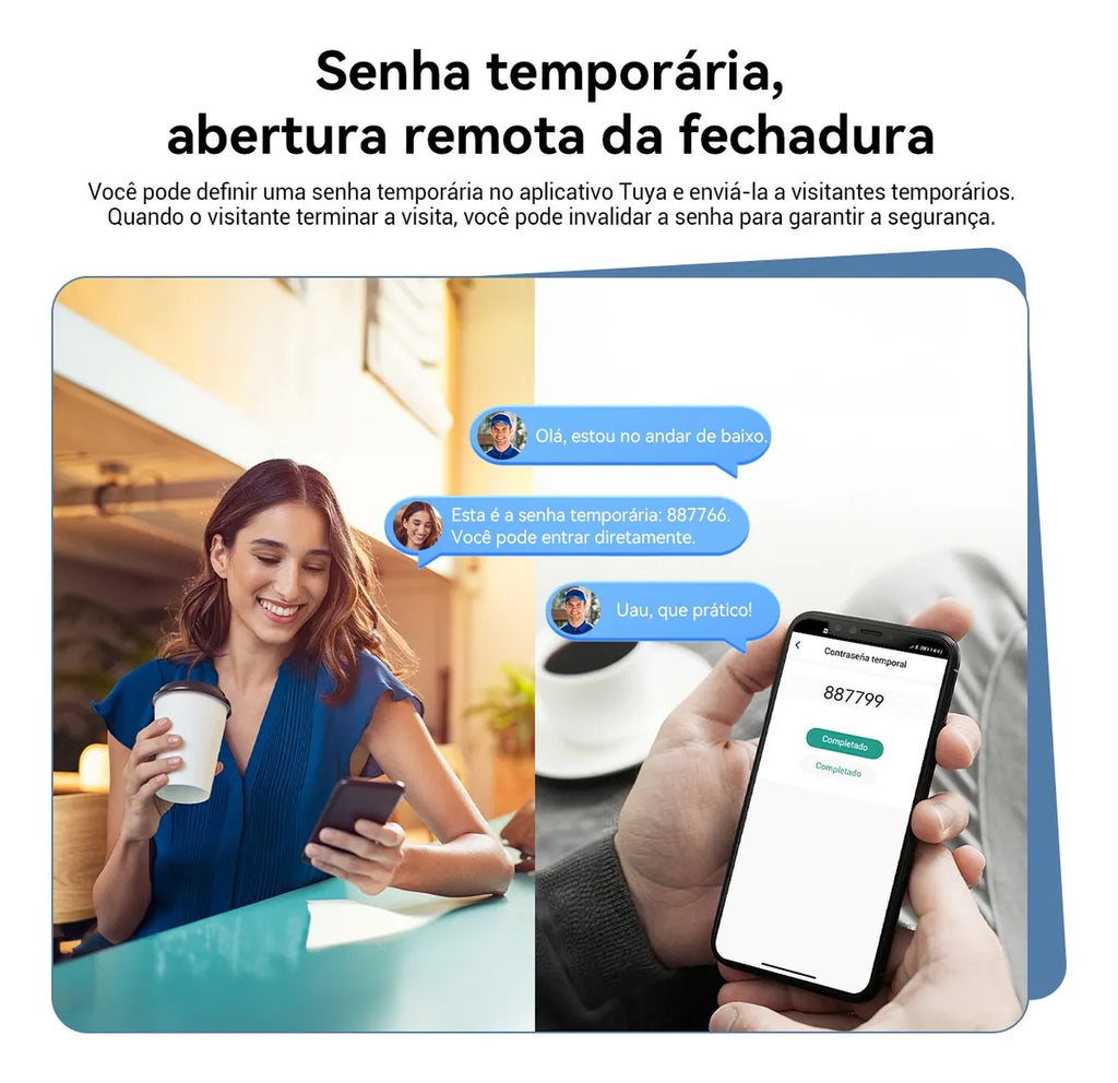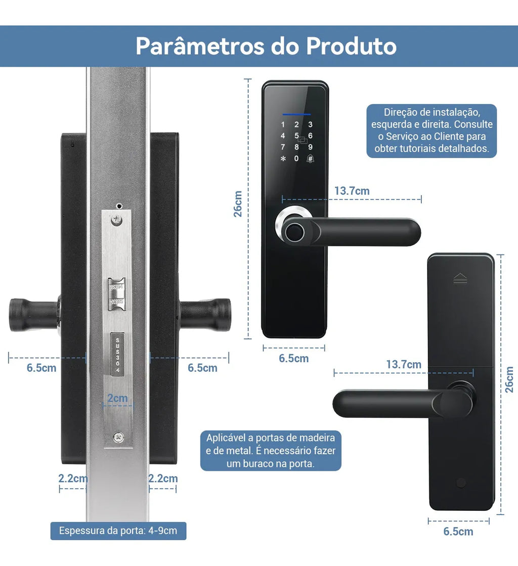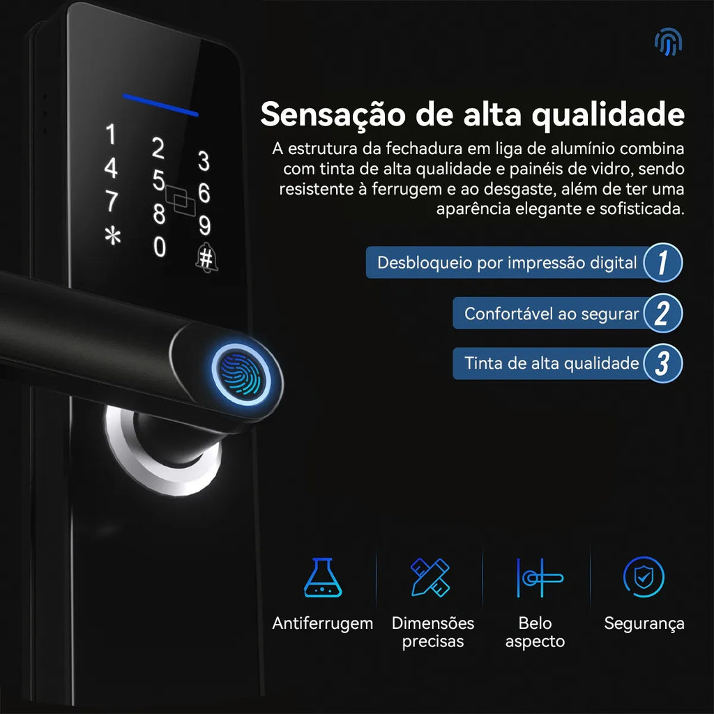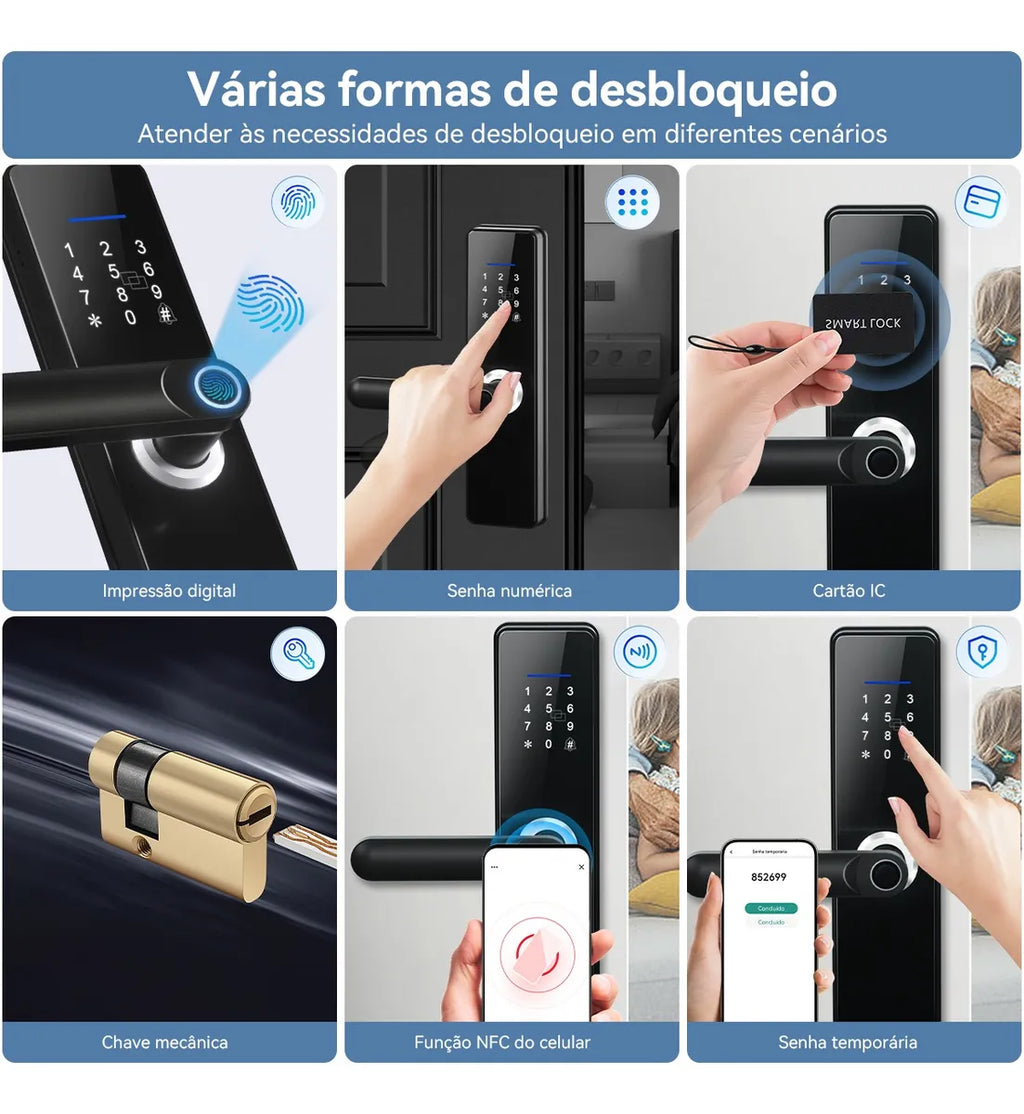 Impressão digital / Senha numérica / Cartão IC / NFC no celular / Chave mecânica / App Tuya / Senha temporária